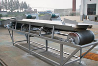 該輸送機(jī)主要由輸送帶、驅(qū)動裝置、傳動滾筒、托輥及機(jī)架等部件組成。